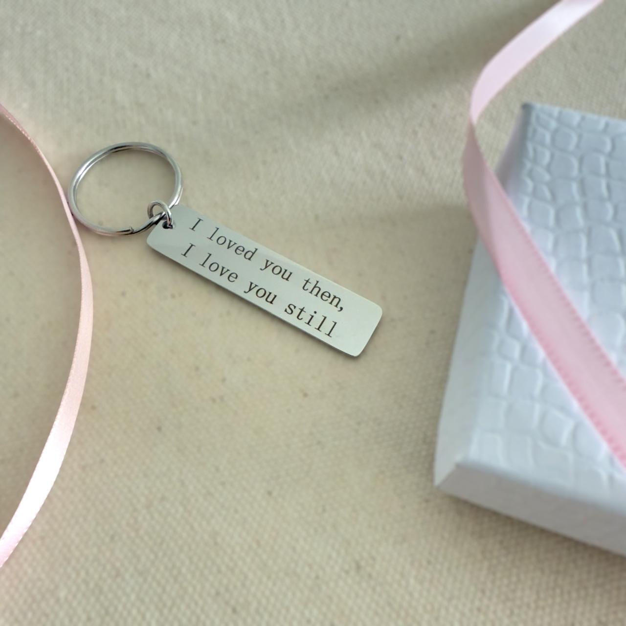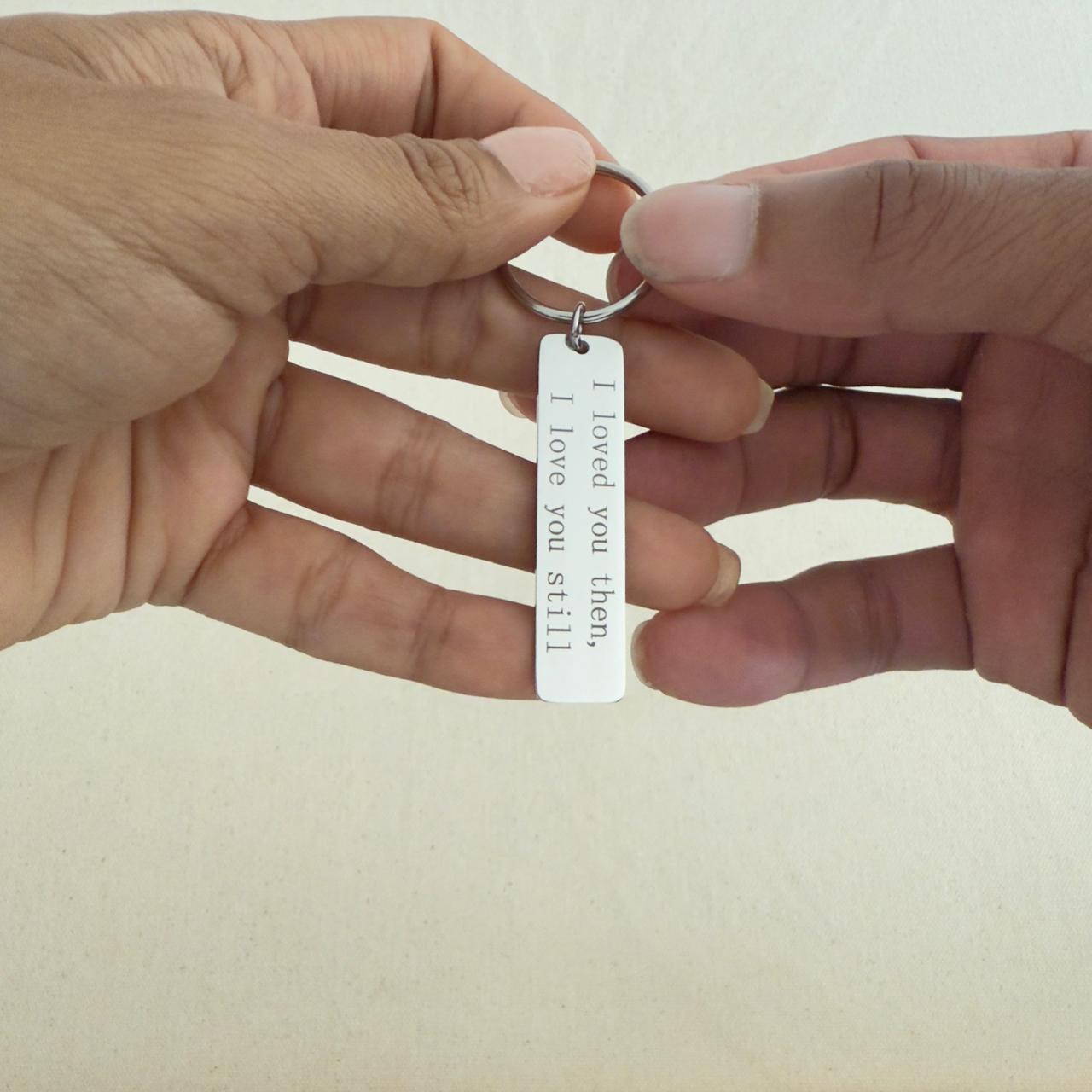 This stainless steel keychain is engraved on the front with the heartfelt message: